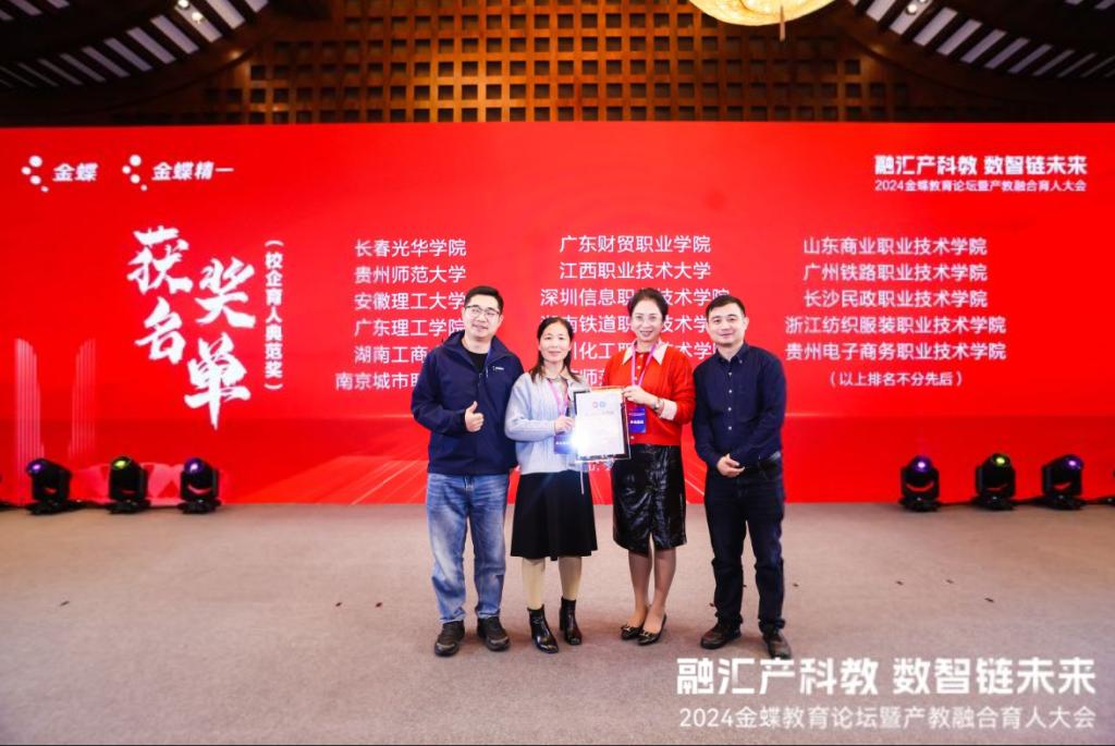 2024年11月10日—11日,2024金蝶教育论坛暨产教融合育人大会在浙江杭州隆重举行。我校经济管理学院院长占跃华和教研室主任陈小秀参会,并荣获金蝶软件(中国)有限公司颁发的“校企育人典范奖”。