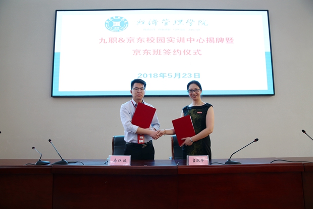 九江职院新闻网讯(经济管理学院) 5月23日下午,我校与京东集团合作共建的“九职·京东校园实训中心”揭牌暨“京东班”签约仪式在濂溪校区图书馆多功能报告厅举行。校长曾青生出席,并与京东全国客服中心人力部总经理蔡旭共同为“九职·京东校园实训中心”揭牌。副校长汪永根、京东全国客服中心校园招聘总经理马江波、京东华中区江西人力资源经理焦瑞勇、经管学院领导班子出席仪式。仪式由占跃华主持,经济管理学院200余名教师、学生代表参加。