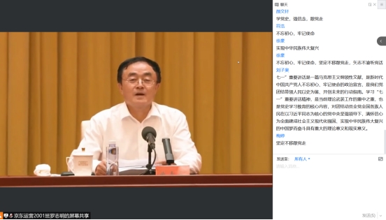 学习过程中,同学们一同观看了由党史学习教育中央宣讲团成员、中央党史和文献研究院院长曲青山主讲的《学习贯彻习近平总书记“七一”重要讲话精神专题宣讲报告会》。课程主要讲解了习近平总书记“七一”重要讲话的重大意义、主要内容和丰富内涵。在线上对话框中,同学们积极展开交流,同步跟进留言,发表学习心得。2020级入党积极分子刘丽珍表示,身为一名入党积极分子,更应该坚定共产主义信念,传承伟大建党精神,为实现中华民族伟大复兴的中国梦贡献自己的青春和智慧。