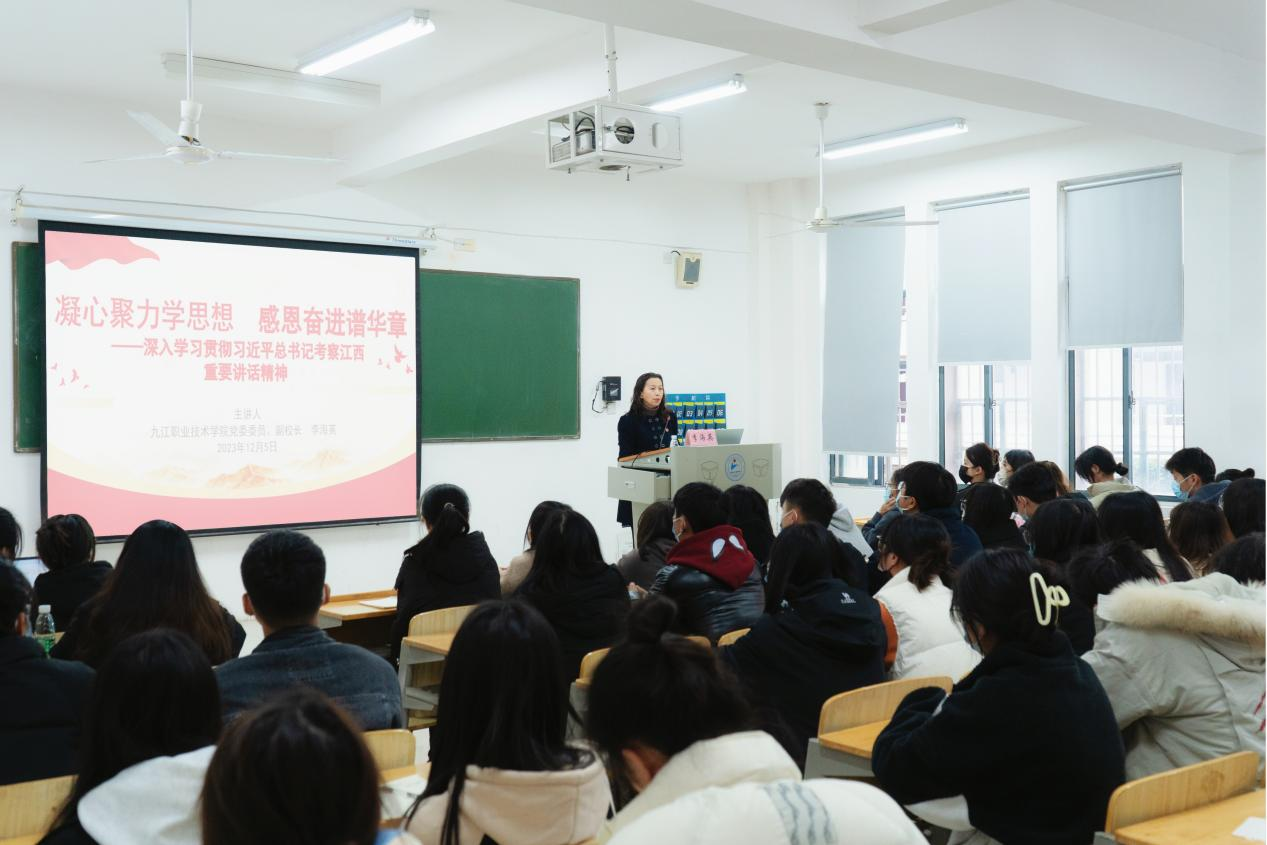 课堂上,李海英带领同学们深入学习了习近平总书记考察江西重要讲话精神,围绕“感悟思想伟力,凝聚奋进力量”、“感悟发展成就,强化使命担当”、“绽放绚丽青春,不负青春年华”三个方面详细进行了讲解。她寄语学生:要紧跟时代步伐,厚植专业情怀、深耕专业认知,养成追求卓越的工匠之心,锤炼开拓创新的奋斗之心,在全面建设社会主义现代化国家的火热实践中绽放绚丽之花。