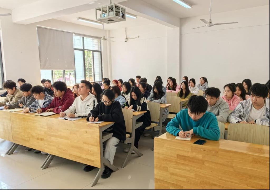 课堂上,李海英先从绿色发展、文化自信、创新驱动三组关键词出发,带领同学们深入学习习近平总书记考察江西重要讲话精神;再以两会热词“新质生产力”为切入点,对全国两会精神进行学习领悟,让大家更加深刻领会今年全国两会精神。最后,她勉励同学们,要紧扣时代脉搏,把握人生规划,将个人的理想追求融入党和国家事业之中,争做复兴栋梁、勇当强国先锋。