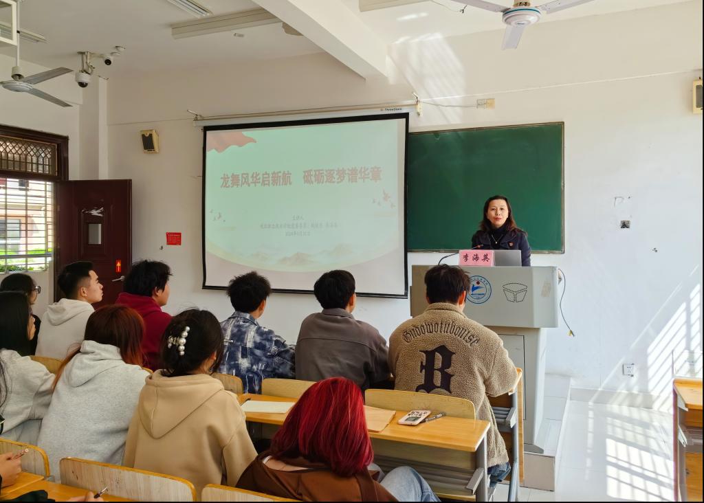 九江职院新闻网讯(经济管理学院 毛秋月)3月26日,校党委委员、副校长李海英在濂溪校区教学楼以“龙舞风华启新航 砥砺逐梦谱华章”为主题,为经济管理学院50名学生代表讲授思政课。