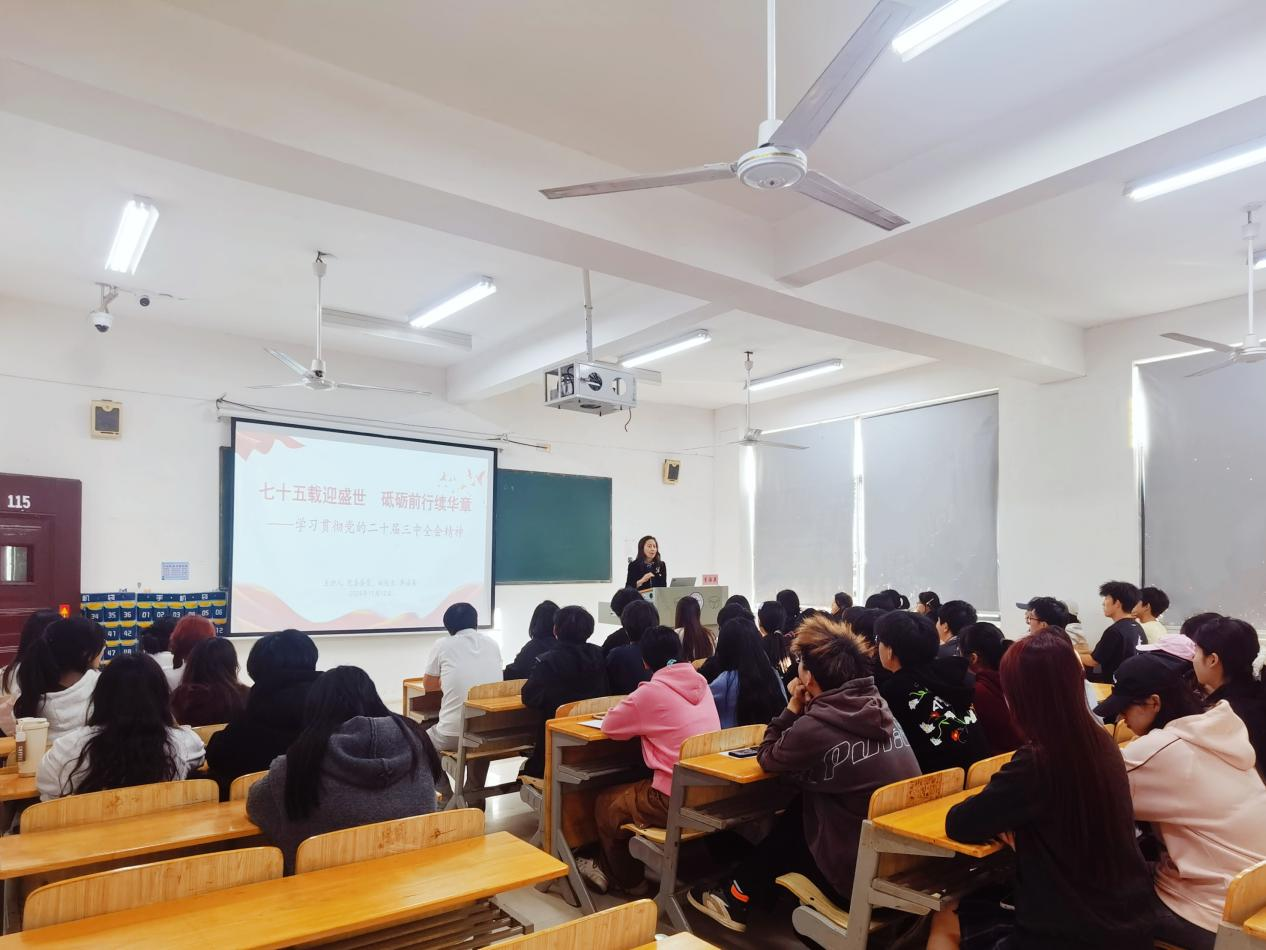 本网讯 (经济管理学院 殷梓轩)11月12日下午,经济管理学院在教学楼115教室举办学习贯彻党的二十届三中全会精神报告会,校党委委员、副校长李海英以《七十五载迎盛世 砥砺前行续华章》为题做专题宣讲,该院50余名学生代表参加。