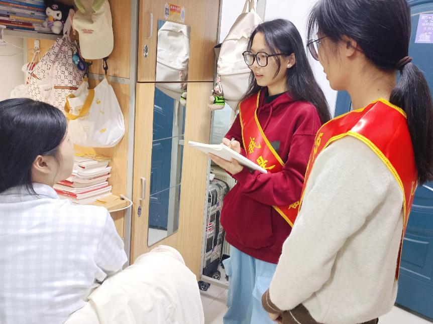毕业生党员带领大家组成宿舍温馨巡访小组,深入每一间宿舍,仔细检查电器使用、消防设施配备是否存在隐患情况,同步宣讲安全知识,提醒用电安全,以增强同学们的安全意识,进一步筑牢学生宿舍的安全防线。