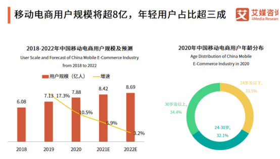 iiMedia Research(艾媒咨询)数据显示,2020年中国移动电商用户规模达到7.88亿人,其中24岁以下用户占比33.5%,预计2022年中国移动电商用户规模将达8.69亿人。