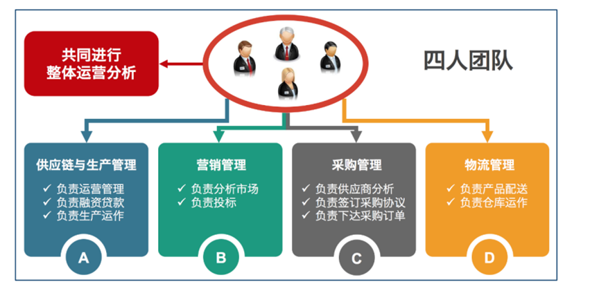 对供应链有一定了解后,会从整体运营的角度让大家进行4人组队进行练习,而供应链运营管理实训过程中专注的资金流、信息流、实物流三流合一的理念,通过理论结合实践的模式,以真实的企业案例背景为依托,让供应链管理的教学更具系统性、更有针对性,效果更显著