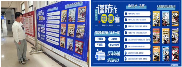 学院精心制作了一批反诈宣传海报,张贴于学生宿舍楼内。海报巧妙融入“大熊猫教你远离电诈”趣味漫画、“八个凡是”等警示标语,以直观生动的形式向学生传递反诈信息,强化学生反诈意识。