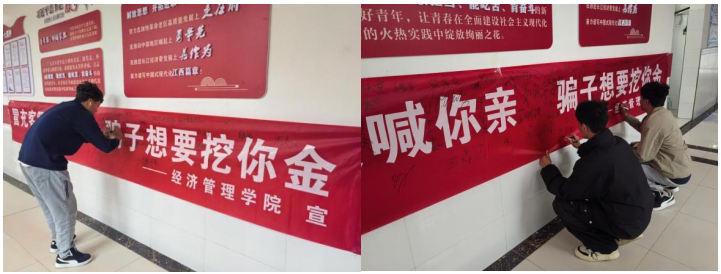 本网讯(经济管理学院)为构建平安校园,近期经济管理学院组织开展了“反诈防骗 你我同行”系列宣传活动,通过专题讲座、海报宣传、标语签名、反诈知识问答等活动形式,全面提升师生防范电信诈骗能力。