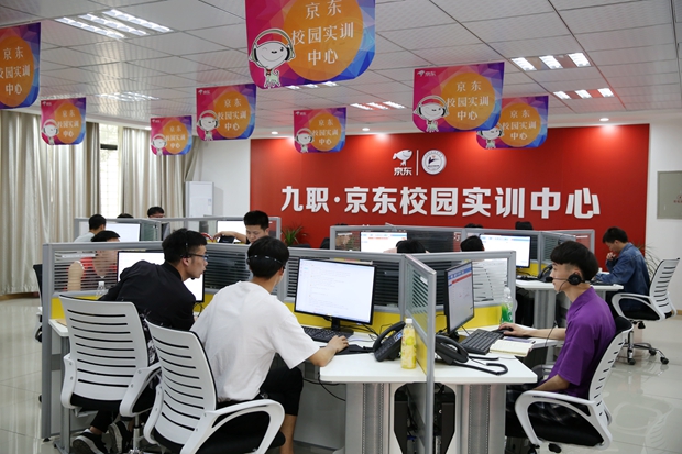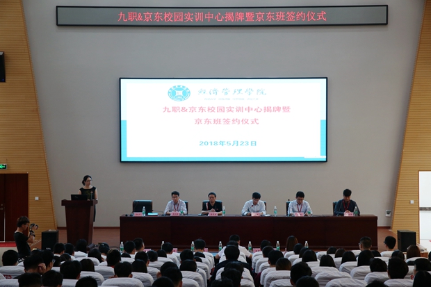 九江职院新闻网讯(经济管理学院) 5月23日下午,我校与京东集团合作共建的“九职·京东校园实训中心”揭牌暨“京东班”签约仪式在濂溪校区图书馆多功能报告厅举行。校长曾青生出席,并与京东全国客服中心人力部总经理蔡旭共同为“九职·京东校园实训中心”揭牌。副校长汪永根、京东全国客服中心校园招聘总经理马江波、京东华中区江西人力资源经理焦瑞勇、经管学院领导班子出席仪式。仪式由占跃华主持,经济管理学院200余名教师、学生代表参加。