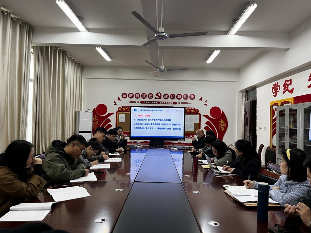 本网讯(经济管理学院)11月19日中午,经济管理学院在教学楼628会议室召开2025届毕业生就业推进会暨岗位实习宣贯会,学院领导班子全体成员出席会议,全体辅导员及毕业班班主任共同参与。